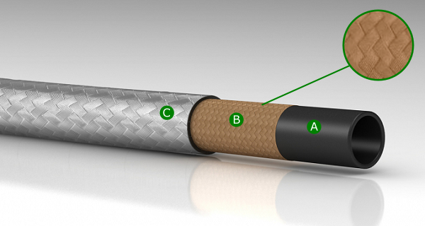 Tubo in gomma trecciato in acciaio zincato idoneo per mandata di fluidi idraulici, oli minerali, lubrificanti, diesel fuel, nafte ed aria